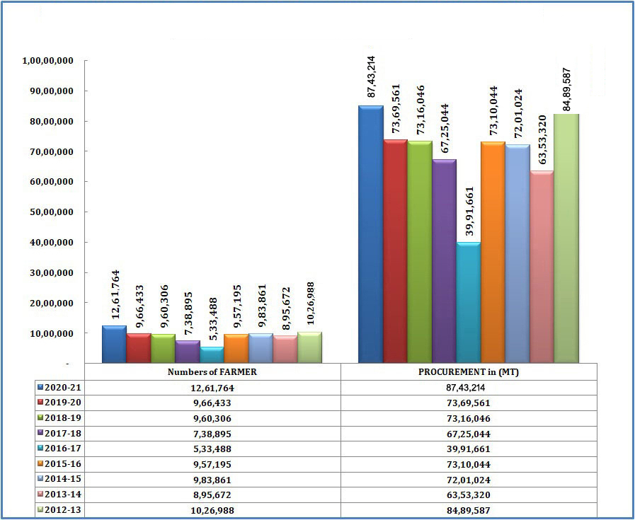 प्रदेश में वर्ष 2013-14 में 63 लाख 53 हजार मी. टन, वर्ष 2014-15 में 72 लाख 1 हजार मी. टन, वर्ष 2015-16 में 73 लाख 10 हजार मी. टन, वर्ष 2016-17 में 39 लाख 91 हजार मी. टन, वर्ष 2017-18 में 67 लाख 25 हजार मी. टन, वर्ष 2018-19 में 73 लाख 16 हजार मी. टन तथा वर्ष 2019-20 में 73 लाख 69 हजार मी. टन गेहूँ का समर्थन मूल्य पर उपार्जन किया गया। यहाँ यह भी उल्लेखनीय है कि इन वर्षों में उक्त कार्य पूरी उपार्जन अवधि लगभग 50 दिन में किया गया था, जबकि इस वर्ष खरीदी प्रारंभ होने के एक महीने की अवधि में ही इससे अधिक गेहूँ का उपार्जन किया गया है।